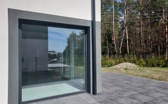 Dzięki ogromnym panoramicznym przeszkleniom wnętrza są zalane naturalnym światłem. Okno tarasowe w systemie SMART SLIDE 3m pozwala na otwarcie przestrzeni na ogród. W oknach dla większego komfortu zamontowano zewnętrzne żaluzje elektryczne.