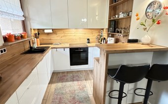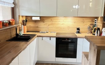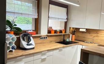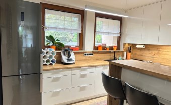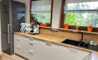 kuchnia (10 m²) w nowoczesnej zabudowie (remont w roku 2022) wyposażona w sprzęt AGD (płyta indukcyjna, piekarnik, zmywarka, lodówko-zamrażarka)
