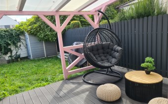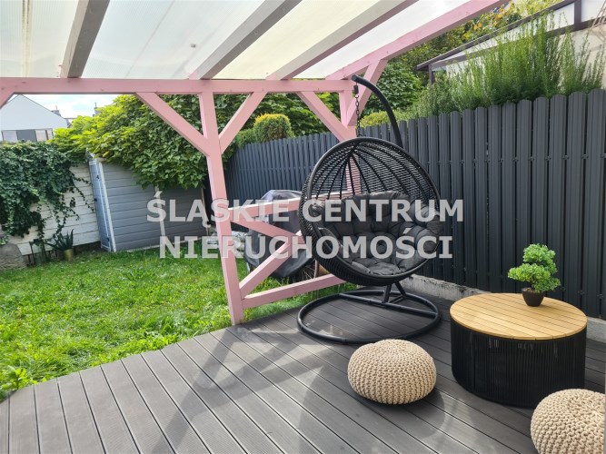Nieruchomość znajduje się na działce o powierzchni z oświetlonym ogródkiem i tarasem. Na zadaszonym tarasie są meble ogrodowe.
