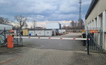 Działka frotowa o kształcie trapezu jest ogrodzona, wjazd zamykany szlabanem, całodobowy monitoring.