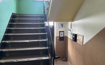 parterze budynku. Wejście z klatki schodowej bezpośrednio dużego pokoju z aneksem kuchennym. Z tego pomieszczenia przejścia do dwóch kolejnych pokoi.