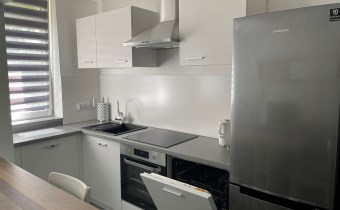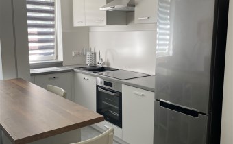 Kuchnia z blatem i krzesłami barowymi, w nowej zabudowie ze sprzętem AGD (zmywarka Whirpool, płyta indukcyjna Whirpool, okap (wyciąg) Kernau, lodówko-zamrażarka Samsung, piekarnik Samsung Dual-Cook, czajnik, toster.