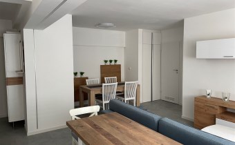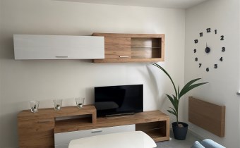 Doskonale doświetlone wnętrze (strona południowa). Wyposażenie salonu to wygodna rozkłada kanapa, stolik kawowy, liczne półki i szafki doskonale wkomponowane w przestrzeń, szafka RTV, nowy telewizor, duży stół z krzesłami, obszerna zabudowana szafa z lustrem.