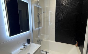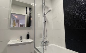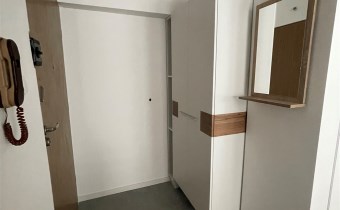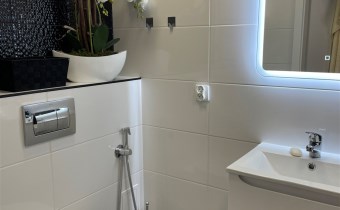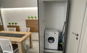 Dodatkowe udogodnienie to szafa gospodarcza z pralką i miejscem na środki czystości.