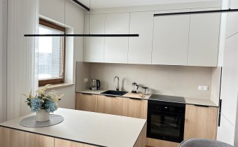 Kuchnia z gustowna zabudową, wyposażona w nowe wysokiej klasy sprzęt AGD – płyta indukcyjna, piekarnik, okap, zmywarka, lodówko-zamrażarka.