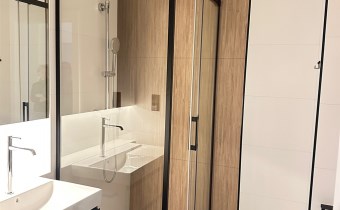prysznicem, wyposażona w umywalką z komodą, szafę na środki czystości na kosmetyki, lustro oraz pralkę.