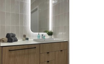 W przestronnej łazience WC, prysznic, umywalka z szafką, lustro.