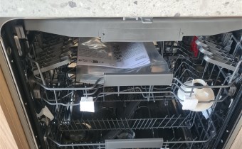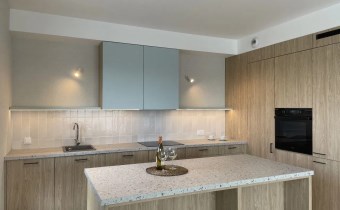Kuchnia w nowoczesna z funkcjonalną zabudową z wysokiej klasy sprzętem AGD (zmywarka, piekarnik, płyta grzewcza, lodówka)